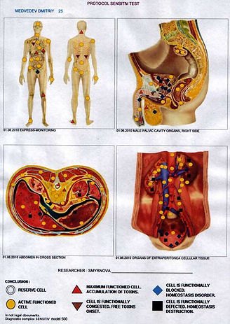 After undergoing SIC CR therapy an objective evidence of improvement in cardiac and general circulation can be confirmed by performing a second Cardiac Diagnostic TO COMPARE TO THE FIRST ASSESSMENT, Myocardial perfusion study, Thallium Stress test, and other non-invasive tests. Nutritional Microscopy Blood tests done after SIC CR therapy to show significant reduction or total elimination of 16 risk factors for heart disease.